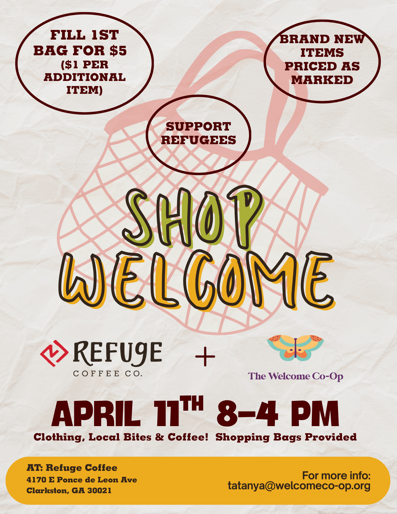 You asked and we are delivering….our next Shop Welcome - Spring Edition will take place on 4/11/2026 from 8am-4pm at Refuge Coffee. Donation collections for this event will take place at The Welcome Co-Op from 3/1/2026 -3/31/2026. Interested in volunteering for the event? Click the links below to register for our available volunteer assignments: